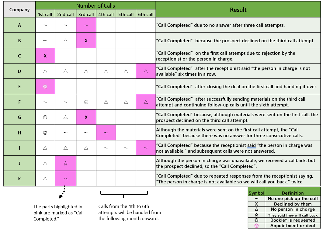 A company is regarded as a “prospective customer” if product-related materials can be sent, or if we are informed by the receptionist that the person in charge is absent. In order to maximize results, follow-up calls to prospective customers may be made in the following months.