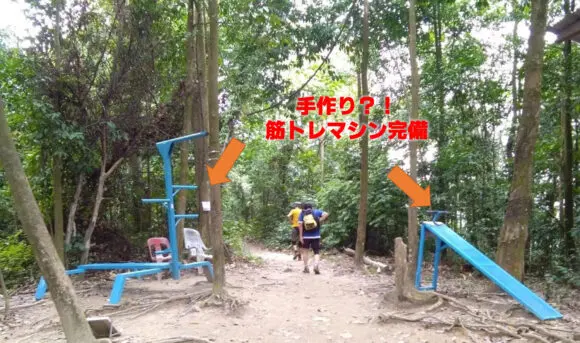 また今回非常に特殊だと感じたのが、下の写真です。なんと頂上付近に筋トレの装置が置かれています。地元のハイキングする人は「日常の筋トレ」としてこの山に来ているようです。