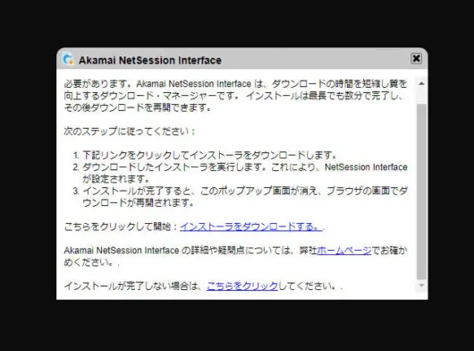 次のようなAkamai NetSession Interfaceをダウンロードする画面が出るのでダウンロードを行ってください。このAkamai NetSession Interfaceダウンロード・マネージャーがインストールされた時点で、Adobe Illustratorインストーラのダウンロードが開始されます。