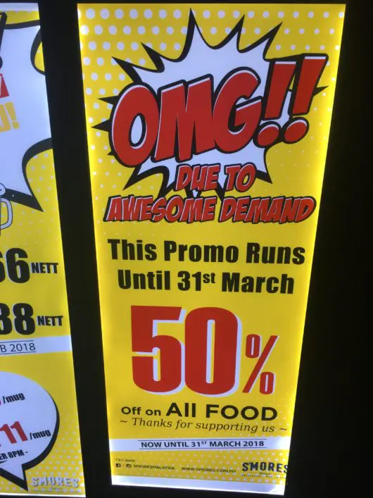 このプロモーションは今月末(3月末)まで行っています。飲み物は対象外,食べ物のみ全品50%OFFです。