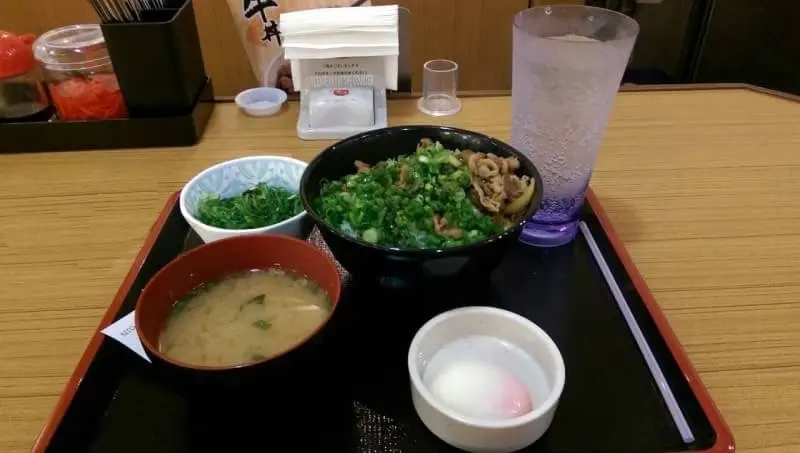 写真はねぎたま牛丼セットです。セットで海藻サラダが付いてきます。飲み物はジュースが選択できます。